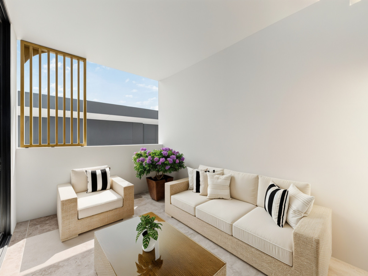 The open-plan living and dining areas flow seamlessly onto a north-facing balcony, perfect for sunlit mornings and golden-hour entertaining.