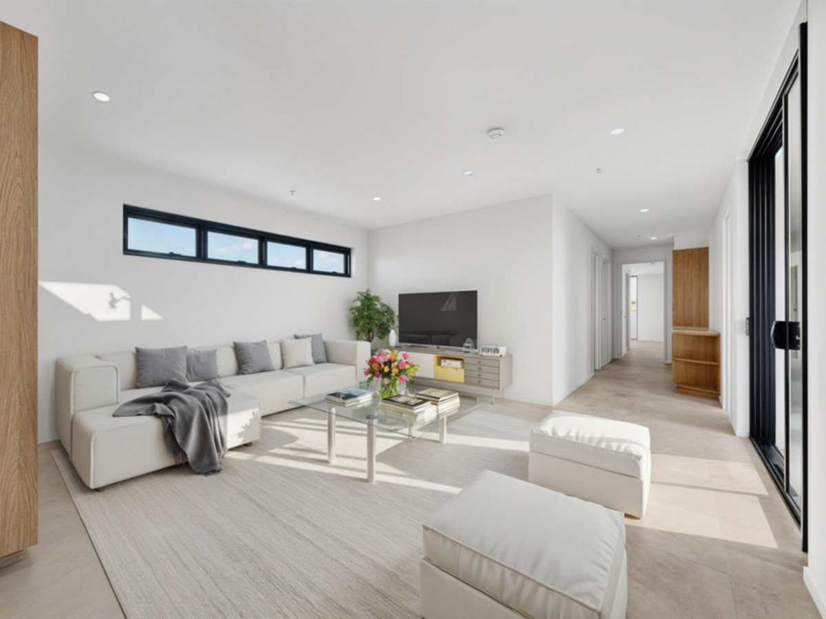 The open-plan living and dining areas flow seamlessly onto a north-facing balcony, perfect for sunlit mornings and golden-hour entertaining.